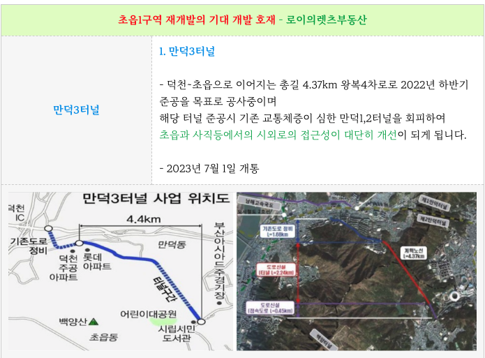 7월 1일 개통인 만덕3터널 은 시외로의 접근성이 더욱 개선되게 되어 기대가 되는 개발호재들 입니다.