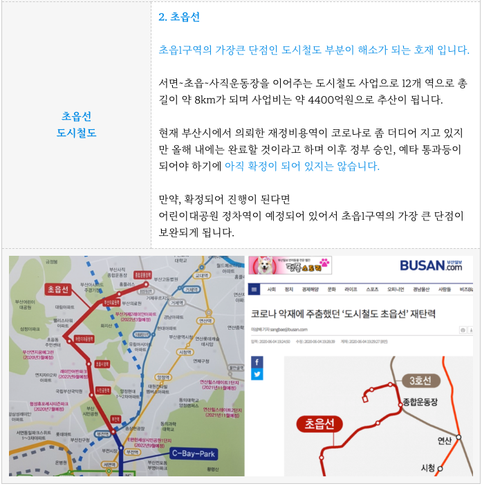 아직 미정인 초읍선도시철도는 가장 큰 단점인 지하철 비역세권을 보완해주는 것으로 접근성이 개선되고