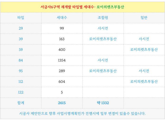 서금사6구역 재개발 의 타입별 세대수 입니다.