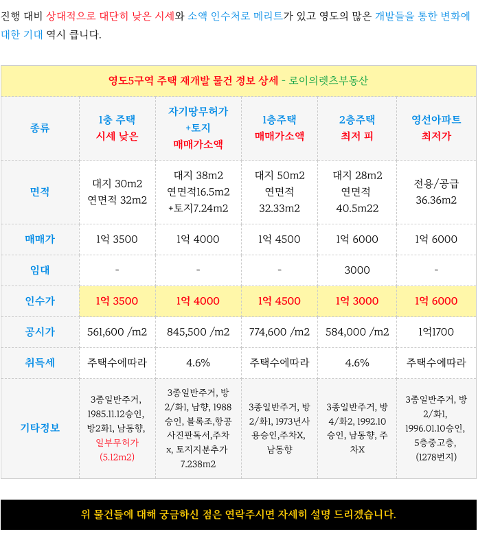 영도5구역 재개발 최저 인수가 매물들 소개 해드리겠습니다.
