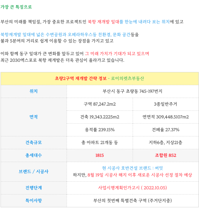 안녕하세요. 로이의렛츠부동산 ( 제이에이케이 부산 부동산중개법인 ) 입니다. 초량2구역 재개발 시공사 계...