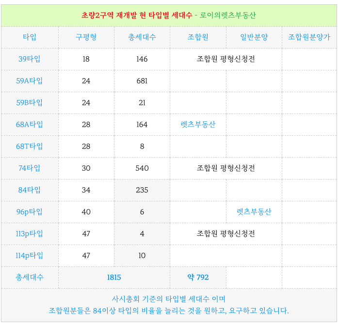 초량2구역 재개발의 현 타입별 세대수 입니다.