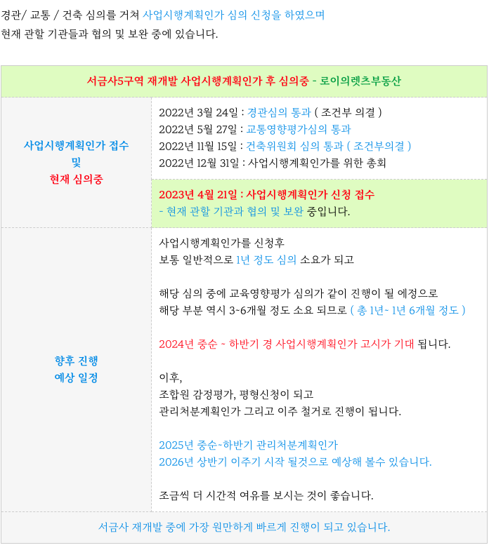 서금사5구역 재개발의 현재까지의 진행상황을 정리등 추가 정보는 아래 페이지를 참고 부탁드립니다.
