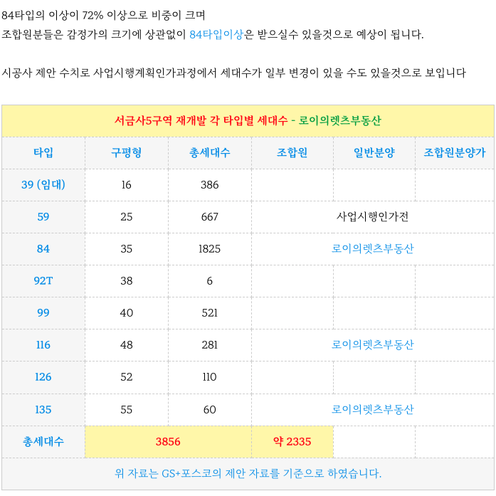 서금사5구역 재개발의 각 타입별 세대수 입니다.