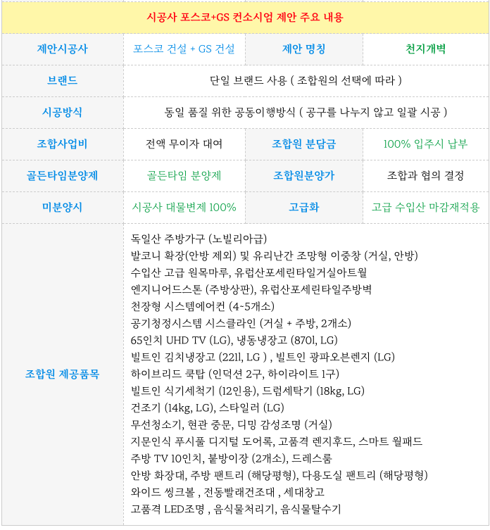 후분양, 조합원분담금 입주시, 고급마감재 사용과 함께