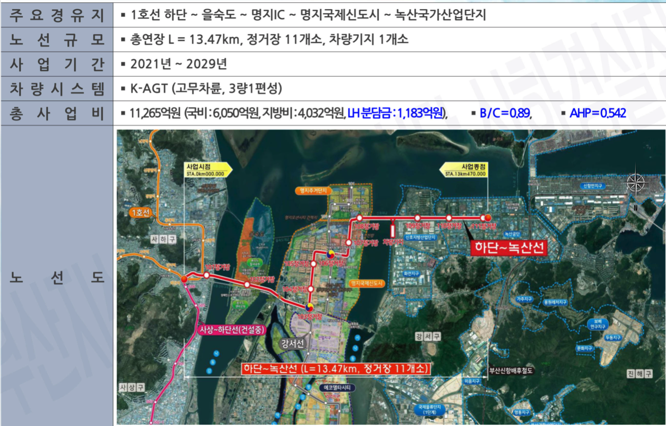 - 하단녹산선은 현재 예비타당성이 통과하여 기본 계획 고시후에 국토부 승인을 앞두고 있는 곳으로
