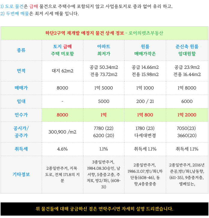 하단2구역 재개발 예정지의 최저 소액 종류별 물건 정보를 업데이트 하여 드리겠습니다.