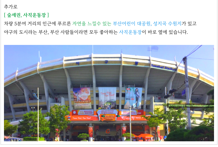 야구의 도시 부산의 사직운동장이 도보 거리에 있으며