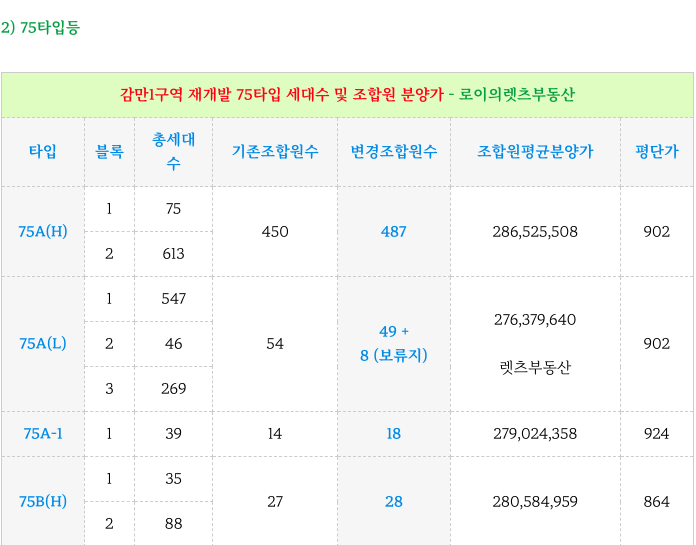 감만1구역 재개발의 각 타입별 세대수 및 조합원 분양가 입니다.