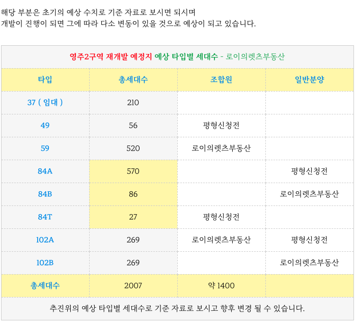 영주2구역 재개발 예정지 추진위 추정 예상 타입별 세대수 입니다.