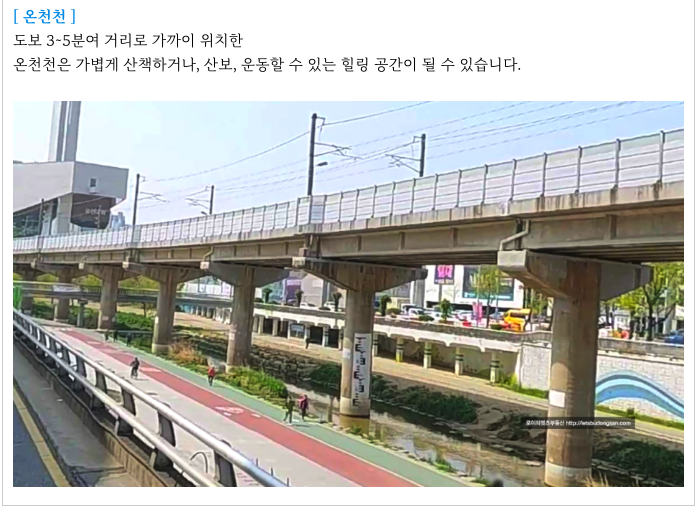 도보 5분여 온천천이 위치하고 있어서 휴식, 산책, 운동하기에도 좋은 입지를 가지고 있으며