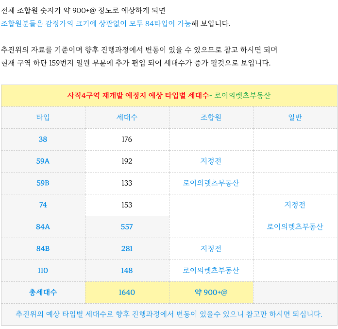 사직4구역 재개발의 추진위에서 밝힌 예상 타입별 세대수 입니다.