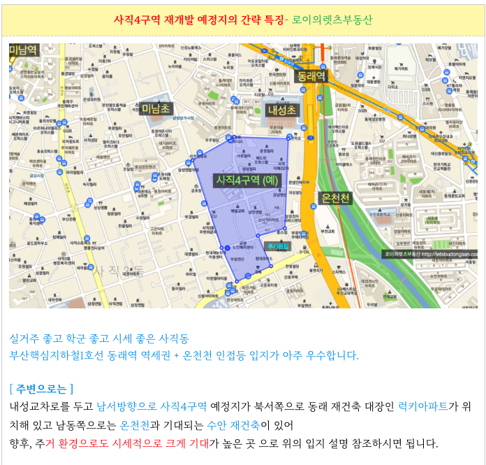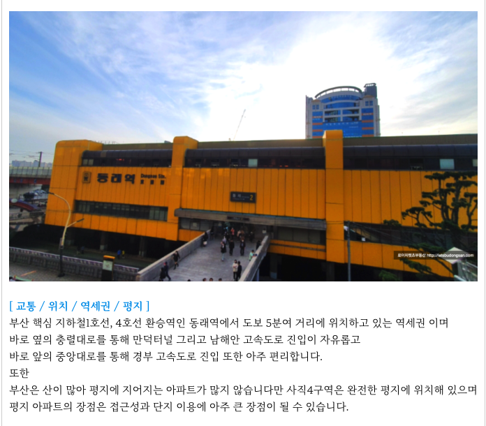- 동래역 역세권, 초품아, 중품아, 학군좋은, 평지, 온천천, 동래 상권 등