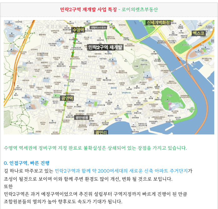 민락2구역 재개발 특징을 간락히 다시 정리하였습니다.