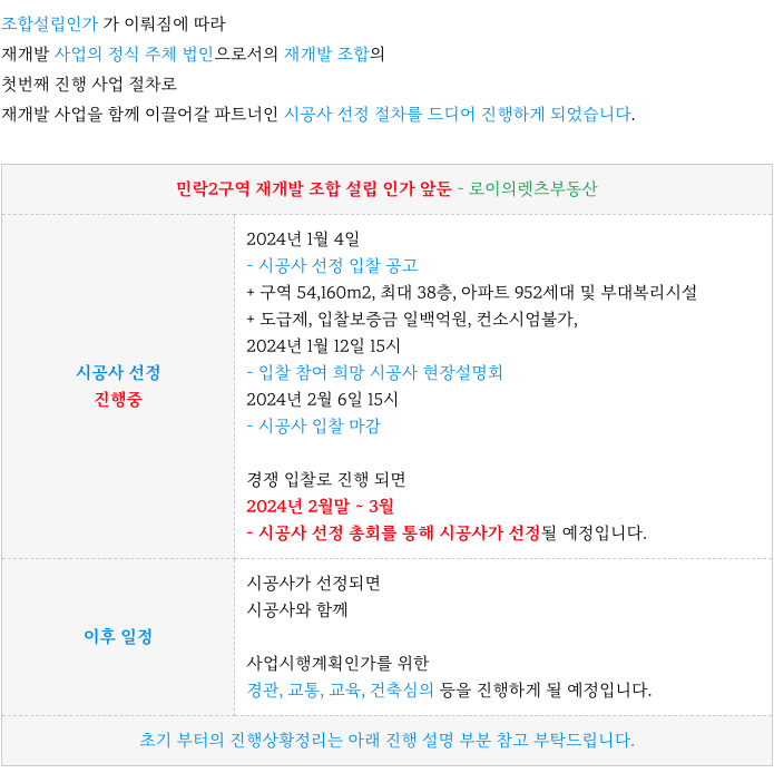 민락2구역 재개발의 현재까지의 진행 상황 정리 등 추가 정보는 아래 페이지를 참고 부탁드립니다.
