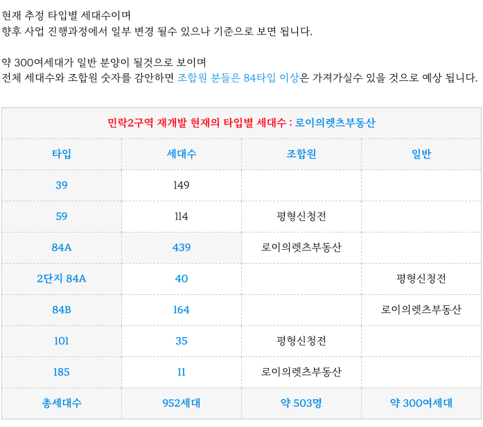 민락2구역 재개발 추정 타입별 세대수 소개하여 드립니다.