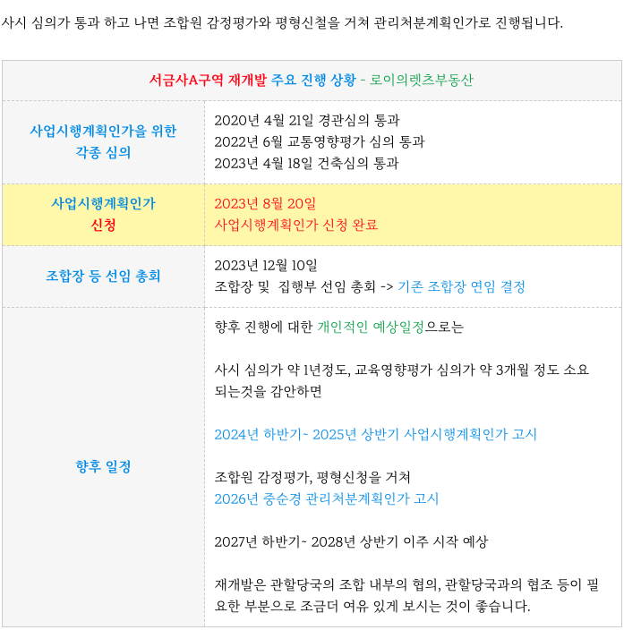 서금사A구역 재개발의 진행상황을 현재까지 간략히 정리하였습니다.