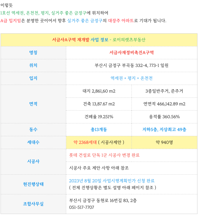 서금사A구역 재개발의 특징을 다시한번 정리하였으니 참고 부탁드립니다.