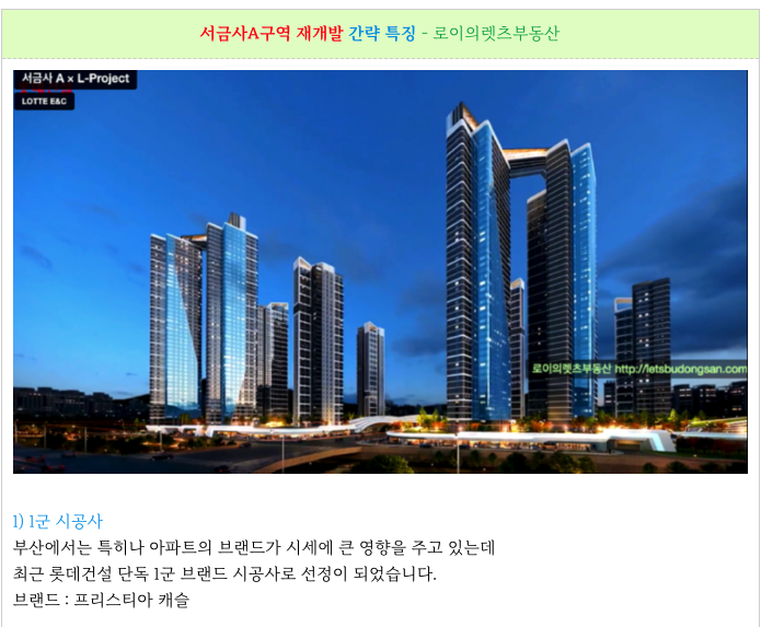 서금사A구역 재개발의 시공사 롯데건설의 주요 제안안을 소개해 드립니다.