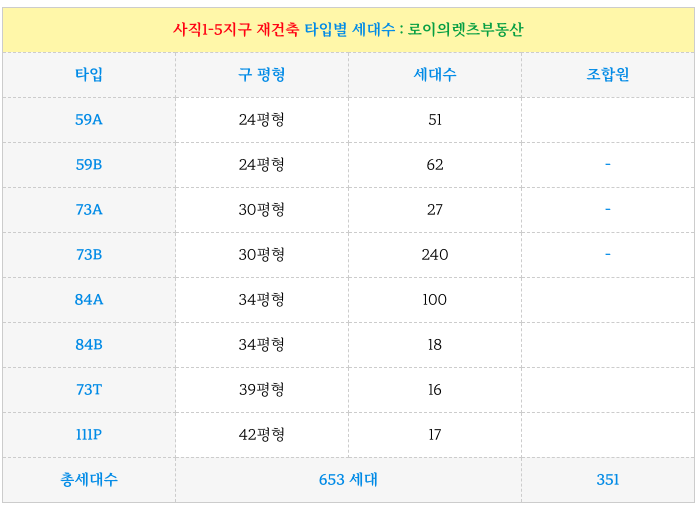 사직1-5지구 재건축 의 타입별 세대수 입니다.