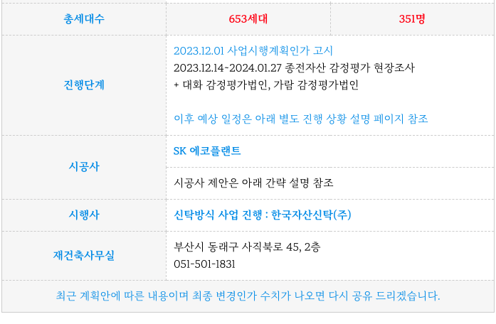 부산 최초로 조합방식이 아닌 사업시행자신탁방식으로 재건축을 진행중에 있습니다.
