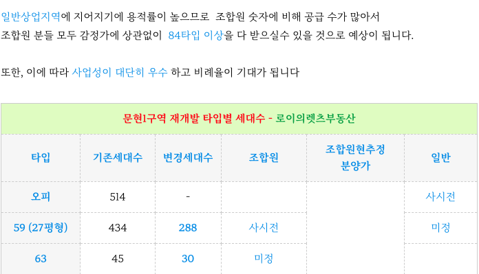 문현1구역 재개발의 타입별 세대수 입니다.