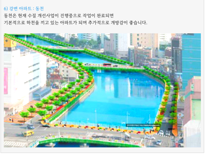 바로 옆으로 동천을 끼고 있어 개방감 역시 대단히 좋으며 강변 아파트의 혜택이 있습니다.