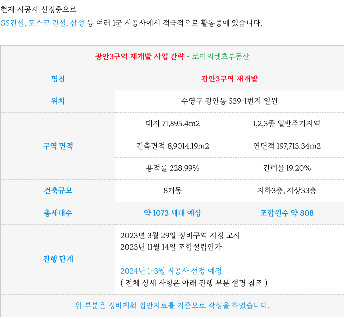 수영구 광안3구역 재개발 초기 진행상황등을 간략히 정리등 추가 정보는 아래 페이지를 참고 부탁드립니다.