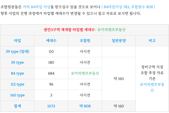 광안3구역 재개발 추정 타입별 세대수 입니다.