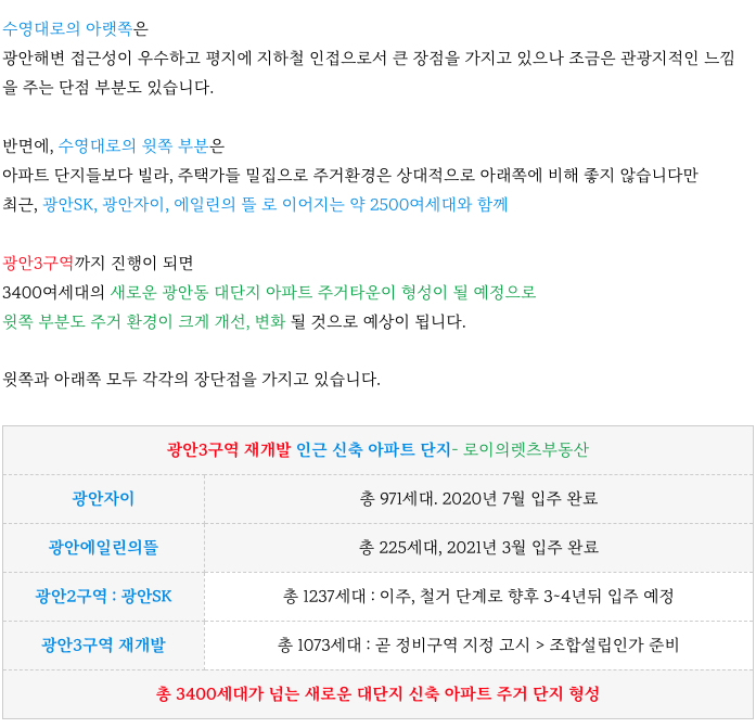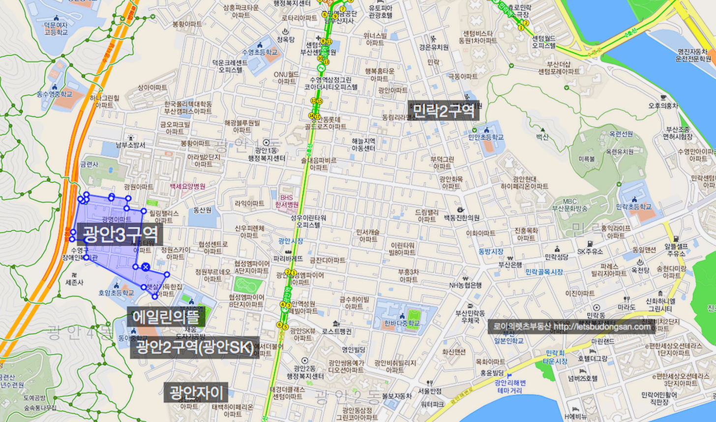 수영구 광안3구역 재개발 이 위치한 광안동의 주변 상황을 정리해 드리겠습니다.