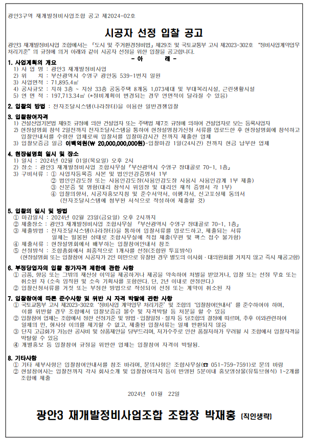 광안3구역 재개발 은 시공사 선정을 위한 입찰을 공고 하였습니다.