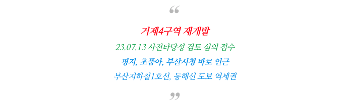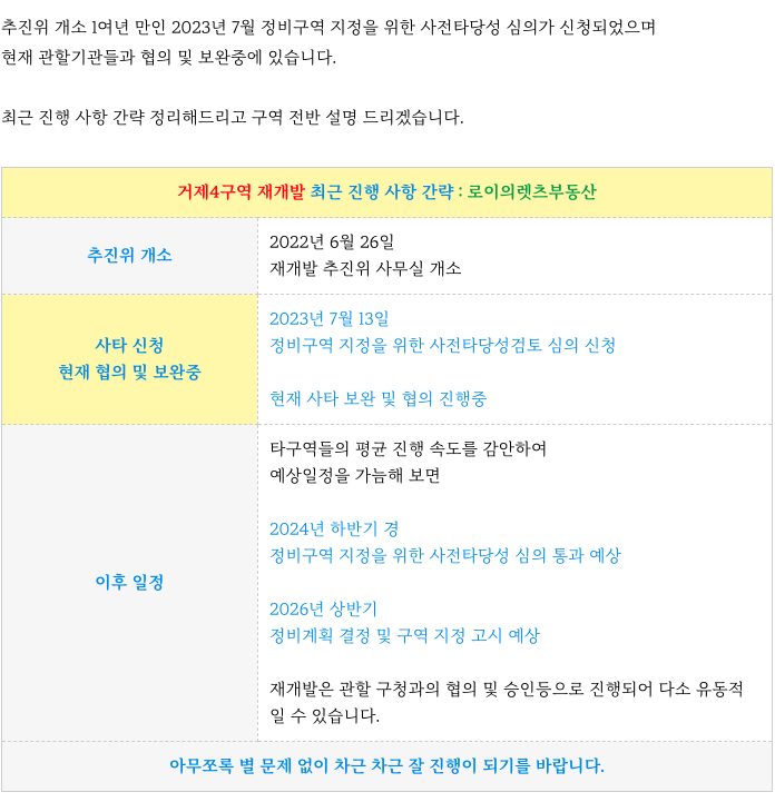 거제4구역 재개발은 현재 사타 심의 협의 및 보완 중에 있습니다.