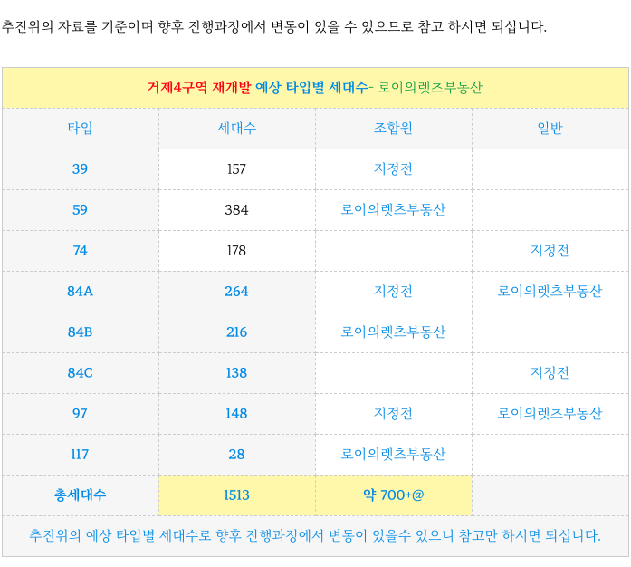 거제4구역 재개발의 예상 타입별 세대수 입니다.