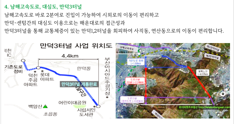 - 시내외 접근성 우수 ( 남해고속도로, 대심도, 만덕3터널 )