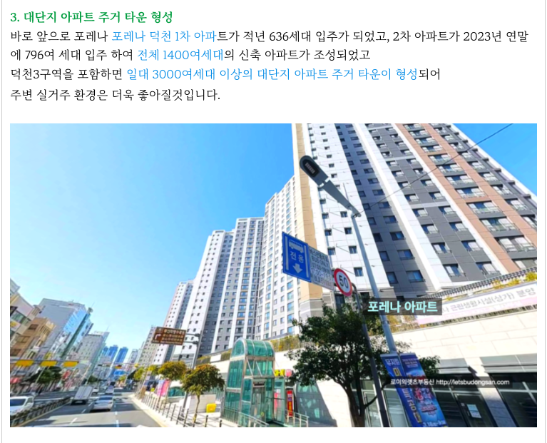바로 앞으로 1400여세대가 넘는 포레나 덕천 1, 2차 아파트가 최근 신축 입주하였고