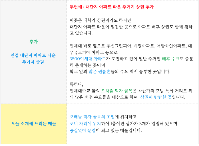 - 인제대 대학가 상권 + 바로옆으로 대단지 아파트 배후 상권