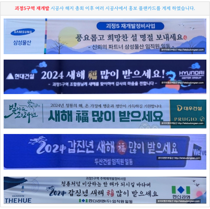 * 시공사 해지 총회 이후 여러 시공사에서 홍보 플랜카드를 게제 하였습니다.