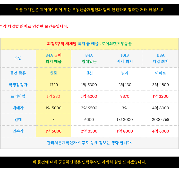 괴정5구역 재개발 84타입 및 각 타입별 최저 급매물 을 소개해 드리겠습니다.