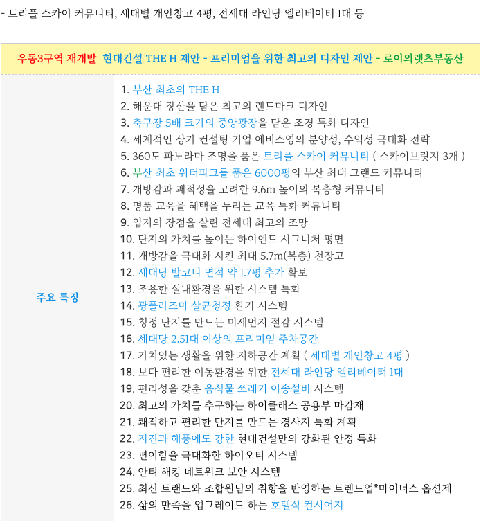 부산에서는 현대건설의 프리미엄 브랜드인 THE H 첫 아파트로 시공사 현대건설 제안 내용 입니다.