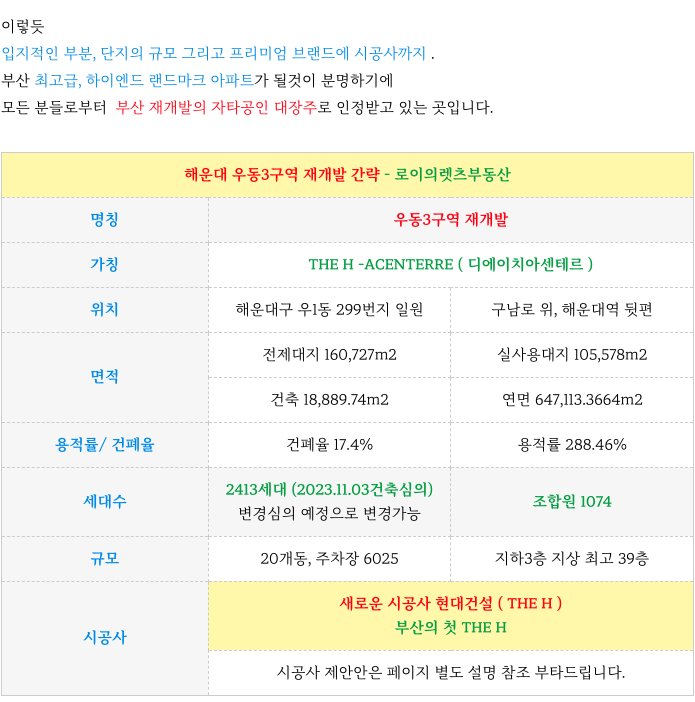 전체 2413세대로 규모 있는 내부 단지가 조성되는 해운대에서의 마지막 대단지로 건설이 되기에
