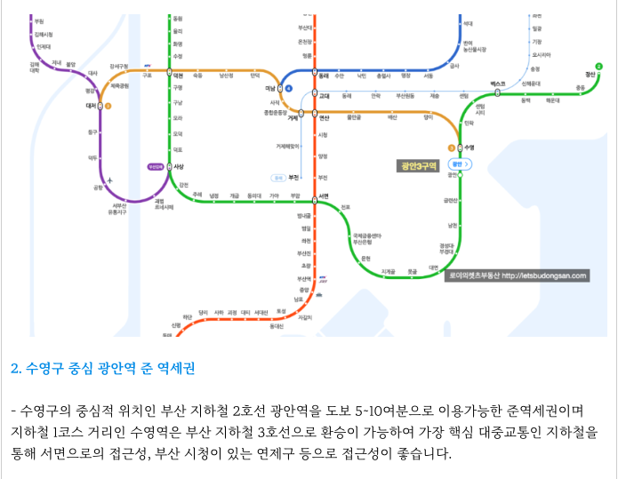 - 수영구 중심 광안동, 광안리 해수욕장, 주변시세 높은