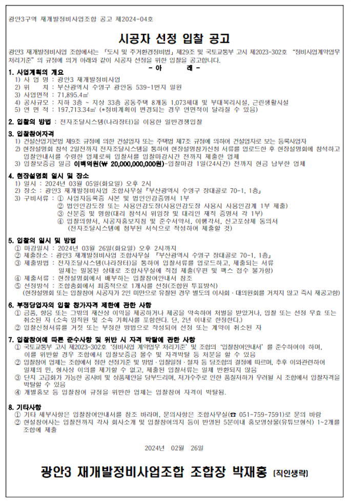 광안3구역 재개발은 조합설립 후 첫 절차로 시공사 선정 절차가 진행중에 있습니다.