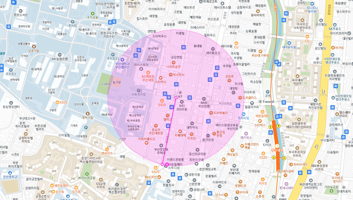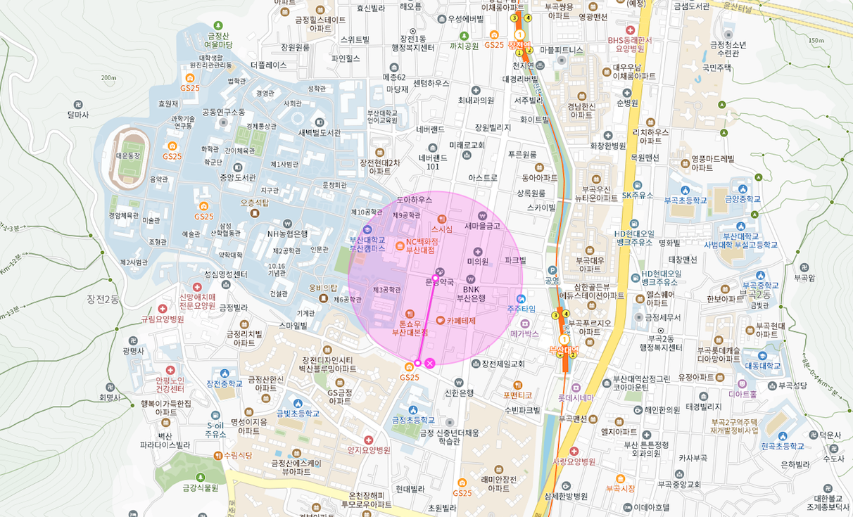 금강로를 기준으로 좌우로 기본 상권으로 두고 부산대 지하철역까지 상권이 이어져 있습니다.