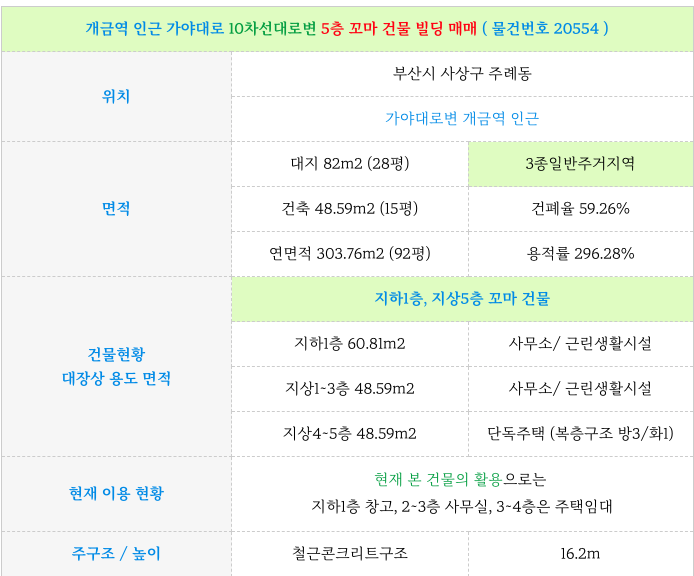 개금역 인근 가야대로 10차선대로변 5층 꼬마 건물 빌딩 매매
