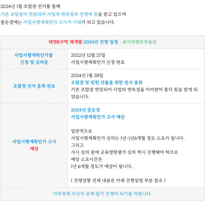 사업시행계획인가 심의 중에 있으며 올해 중순경쯤 인가를 득할 것으로 예상 되며