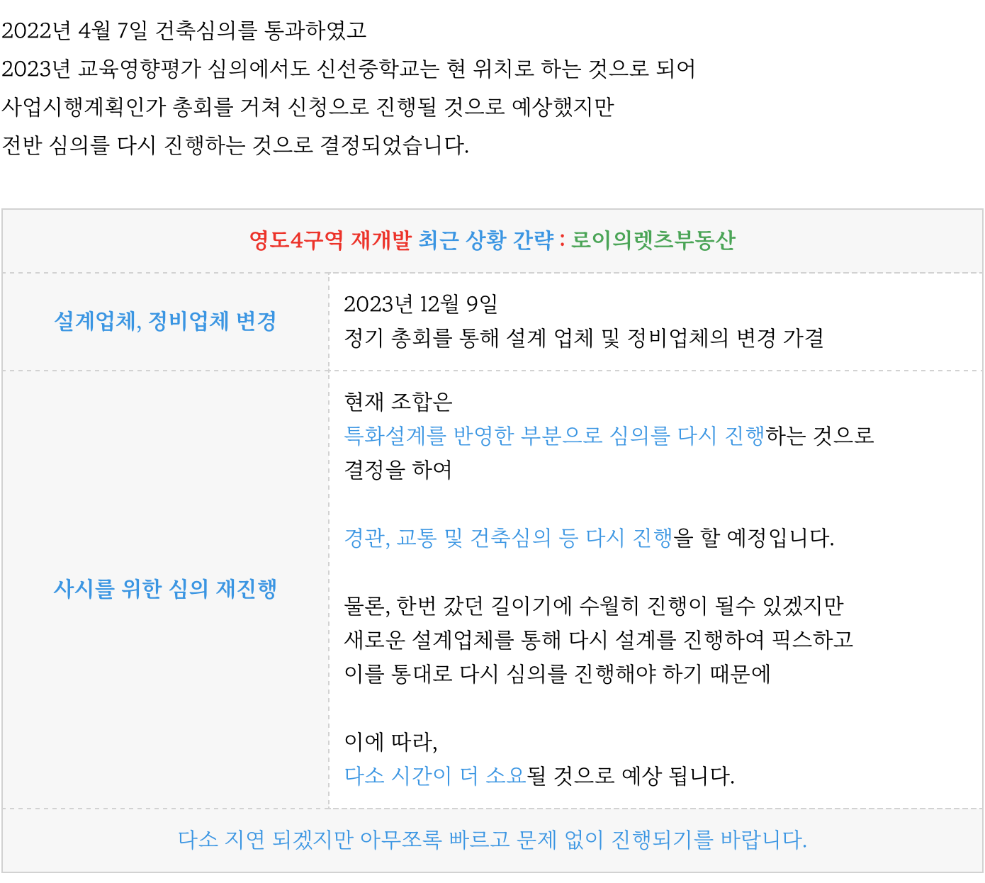 영도5구역 재개발은 변경된 설계 부분에 대해 다시 심의를 진행하기 위해 준비중에 있습니다.