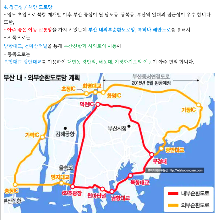 - 서쪽으로 남항대교, 천마선 터널을 이용하여 부산신항과 시외로의 이동