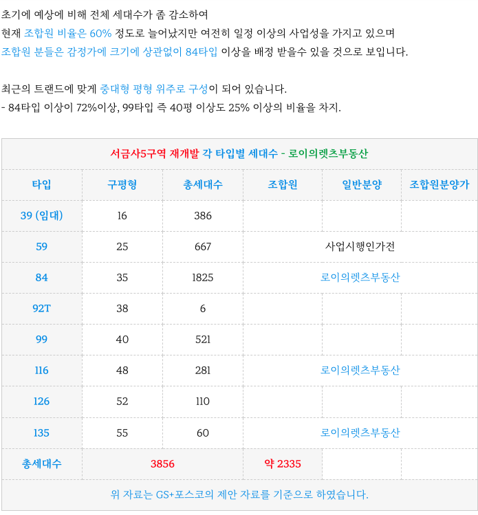 서금사5구역 현재의 각 타입별 세대수 소개 드립니다.