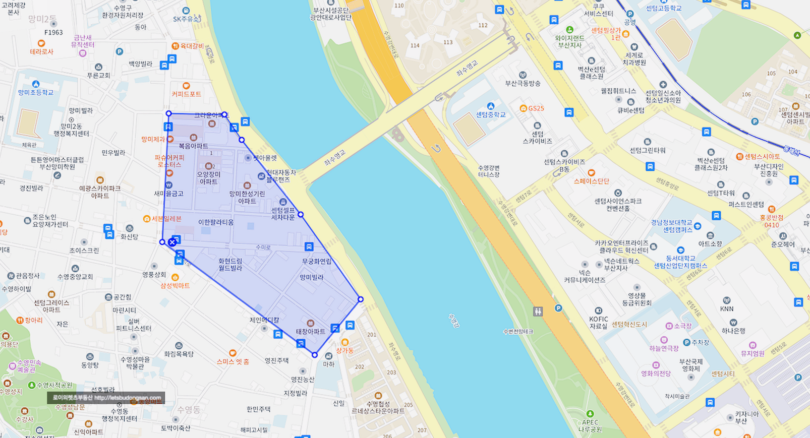 단지 앞으로 좌수영교가 위치하고 있어 센텀은 바로 앞 생활권이며