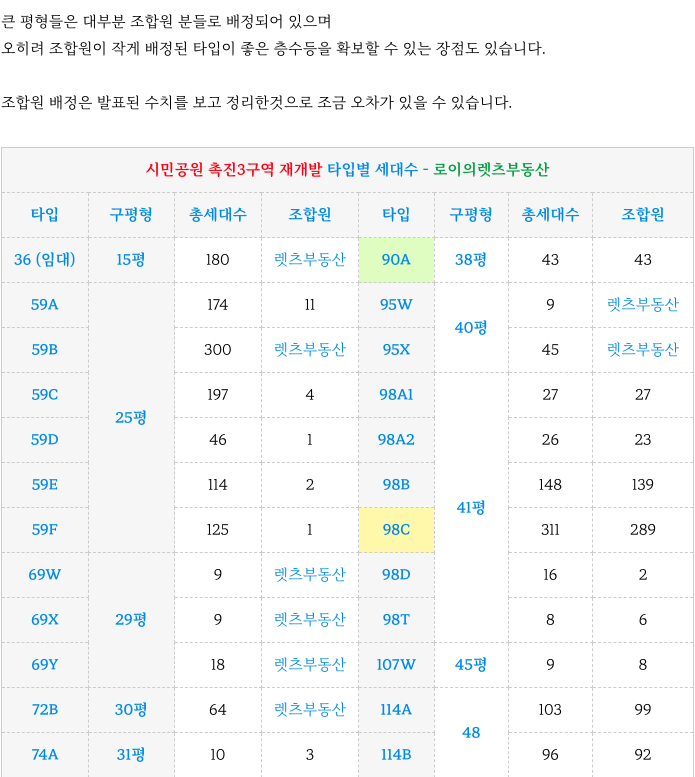 촉진3구역 재개발 조합원 타입별 배정 및 각 타입별 세대수 정리하여 드립니다.